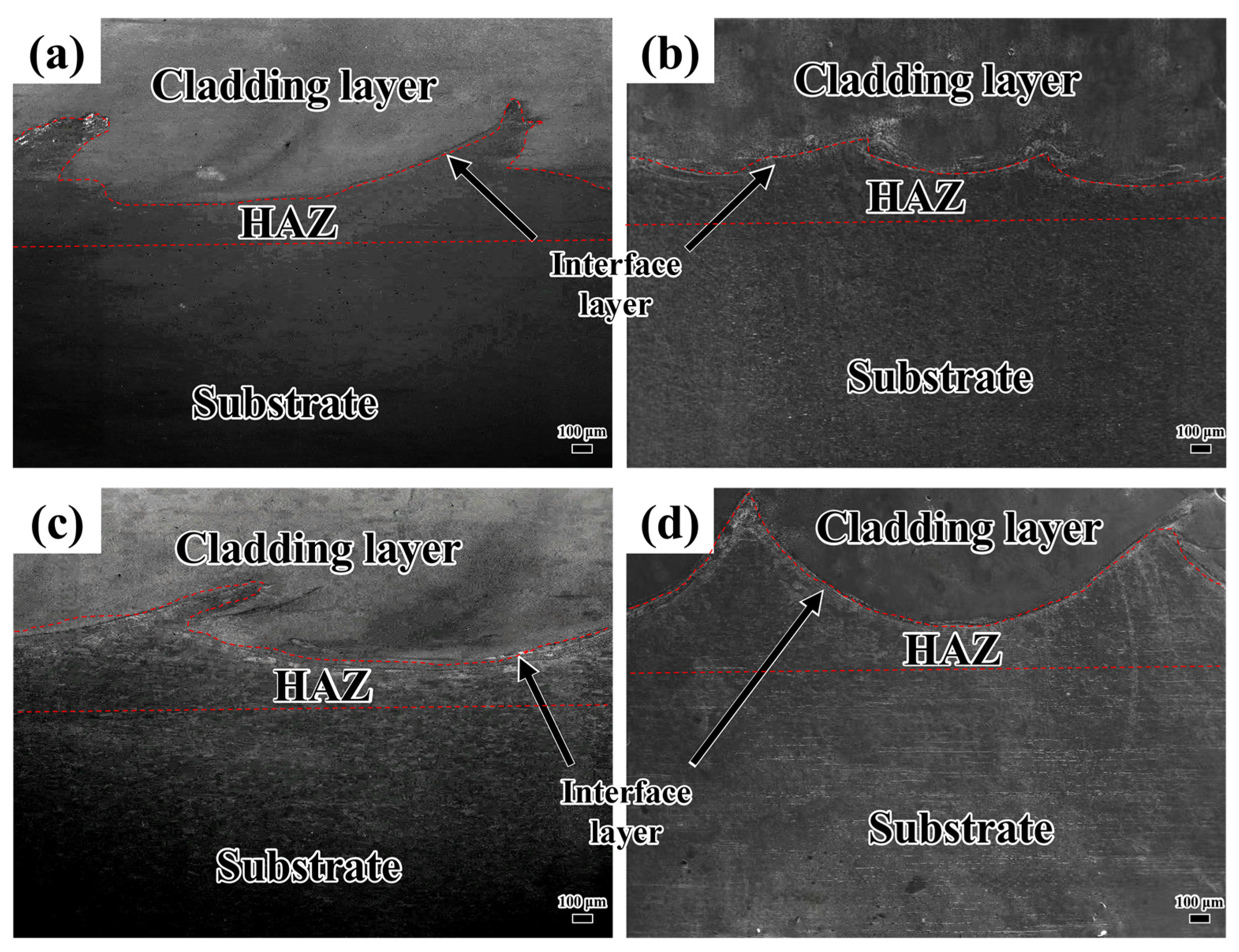 Figure 4 illustrates the microstructure at the interface between the coating and the substrate for various laser scanning speeds. As shown in
