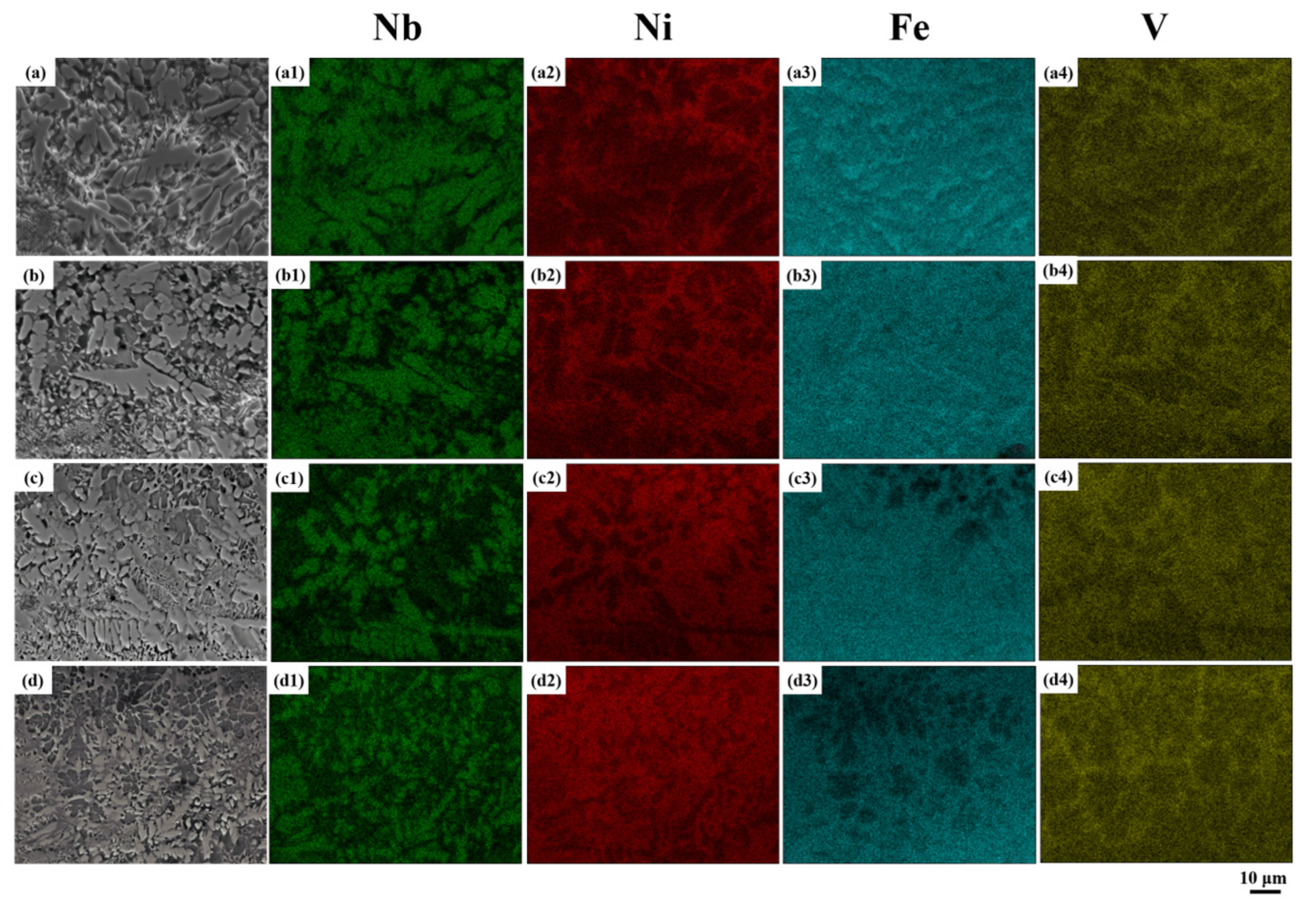 Figure 7(a1–a4), Nb and Fe are primarily concentrated in the eutectic structure, while Ni and V display an opposing distribution. An increase in laser scanning speed enhances the cooling rate, leading to a gradual rise in supercooling, as illustrated in