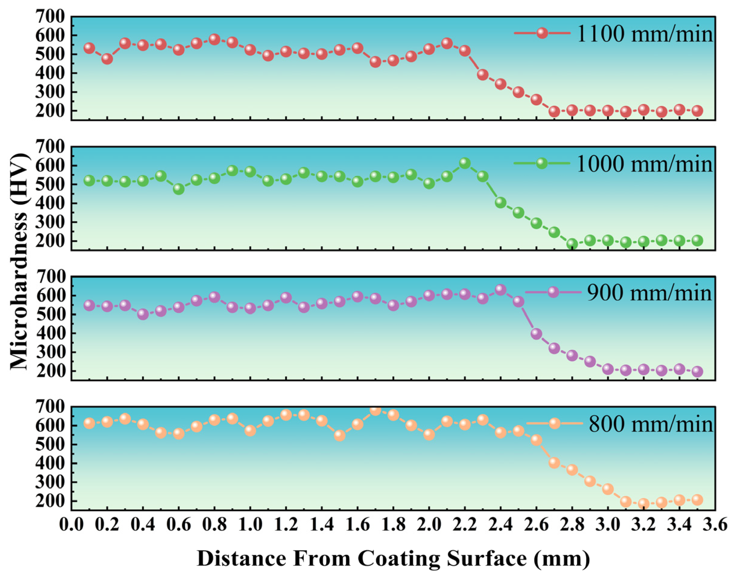 Table 5, the coating hardness diminishes as the laser scanning speed increases. Specifically, the average hardness for the coating produced at 800 mm/min is 606.2 HV, whereas the average hardness for the coating produced at 1100 mm/min is 522.4 HV.