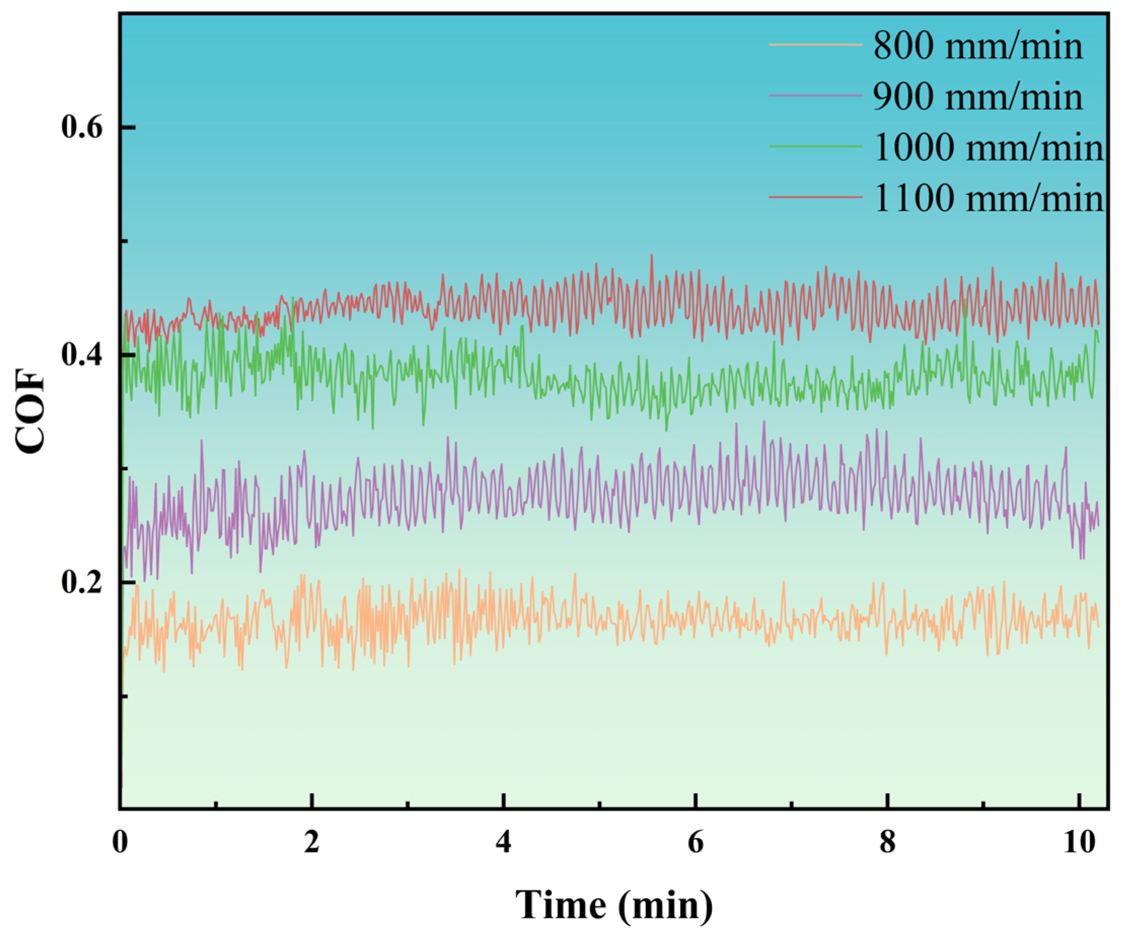 Figure 10, the COF rises steadily with an increase in scanning speed. This trend is closely linked to the microhardness of the coating. At a scanning speed of 800 mm/min, the coating demonstrates the highest microhardness (606.2 HV). This elevated hardness enhances the coating’s resistance to plastic deformation when subjected to sliding friction pairs (Si