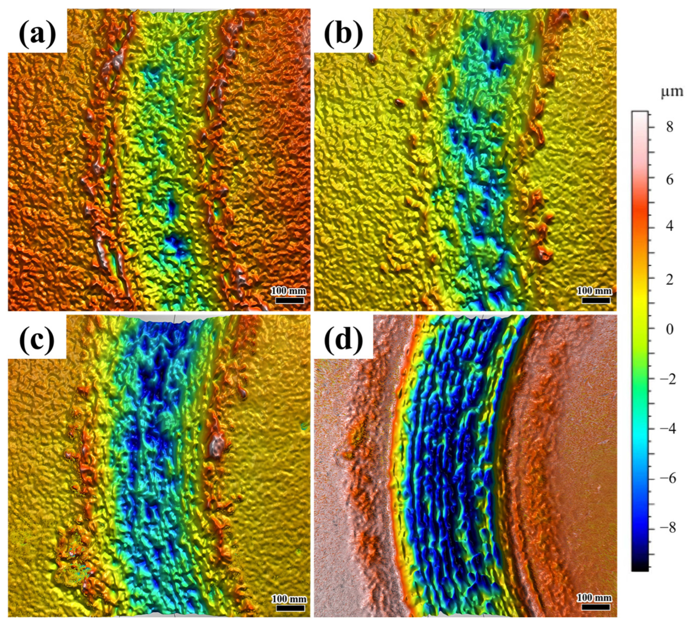 Figure 12d, the wear trajectory sustains the most severe damage, with a maximum depth of approximately −8 μm. The surface is characterized by extensive deep pits and interconnected grooves. This observation aligns with the characteristics of severe adhesive wear. The high defect density (28 holes/mm
