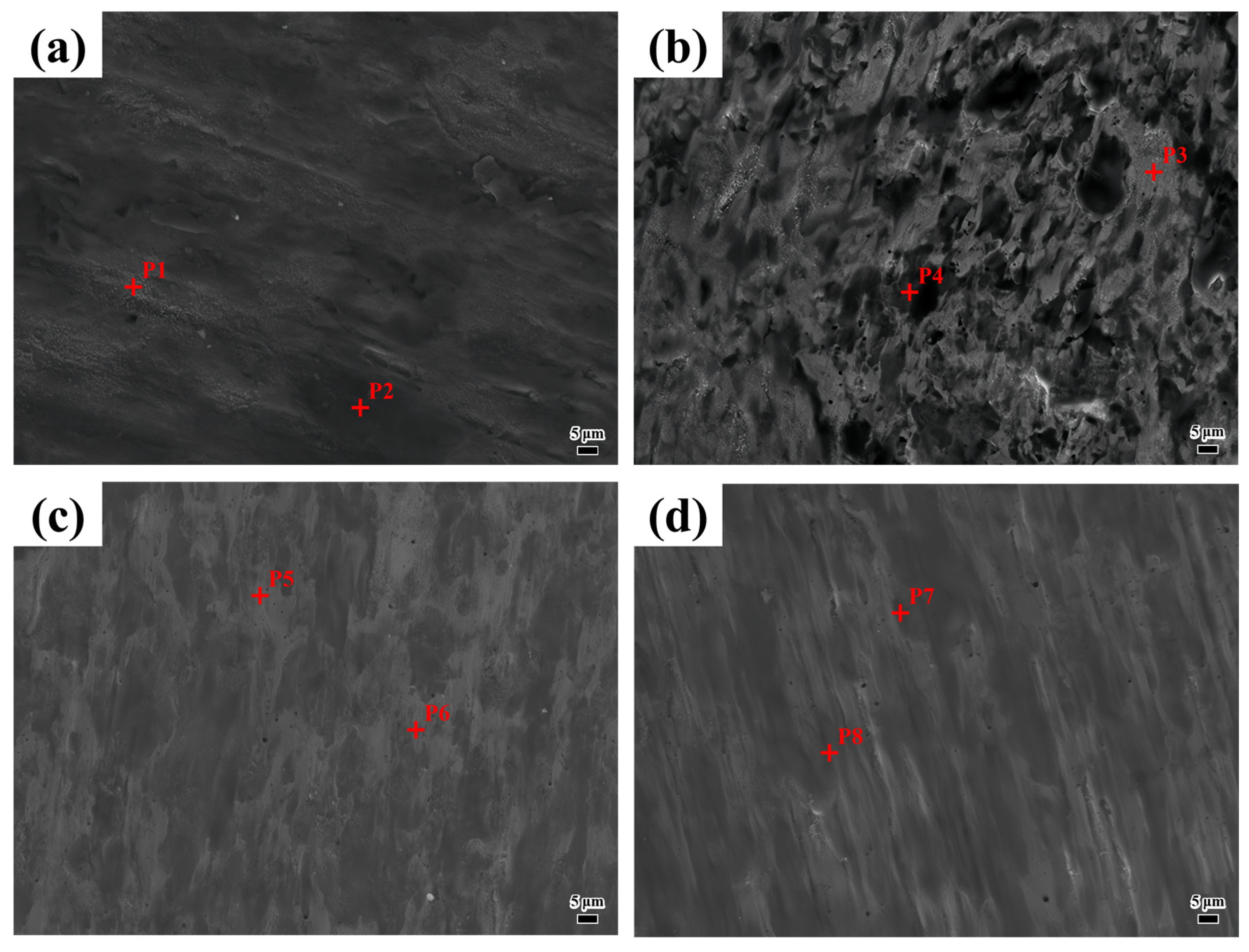 Figure 13b, the worn coating surface exhibits fine scratches and scattered oxide spots, indicating the coexistence of abrasive and oxidative wear mechanisms. Examining the elemental composition at points P3 and P4 in