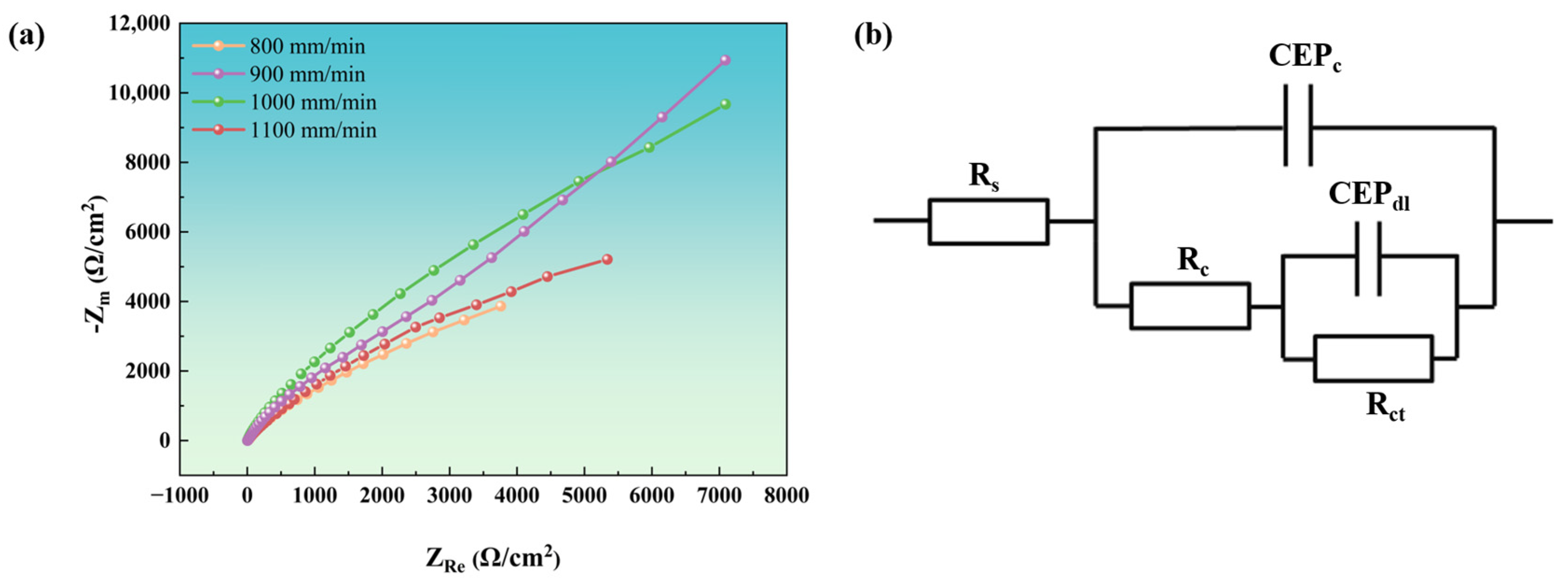 Figure 14a, the Nyquist plots of coatings deposited at different scanning rates exhibit incomplete impedance arcs, making direct determination of the arc diameter challenging. By fitting an equivalent circuit model and analyzing the raw data, the results in