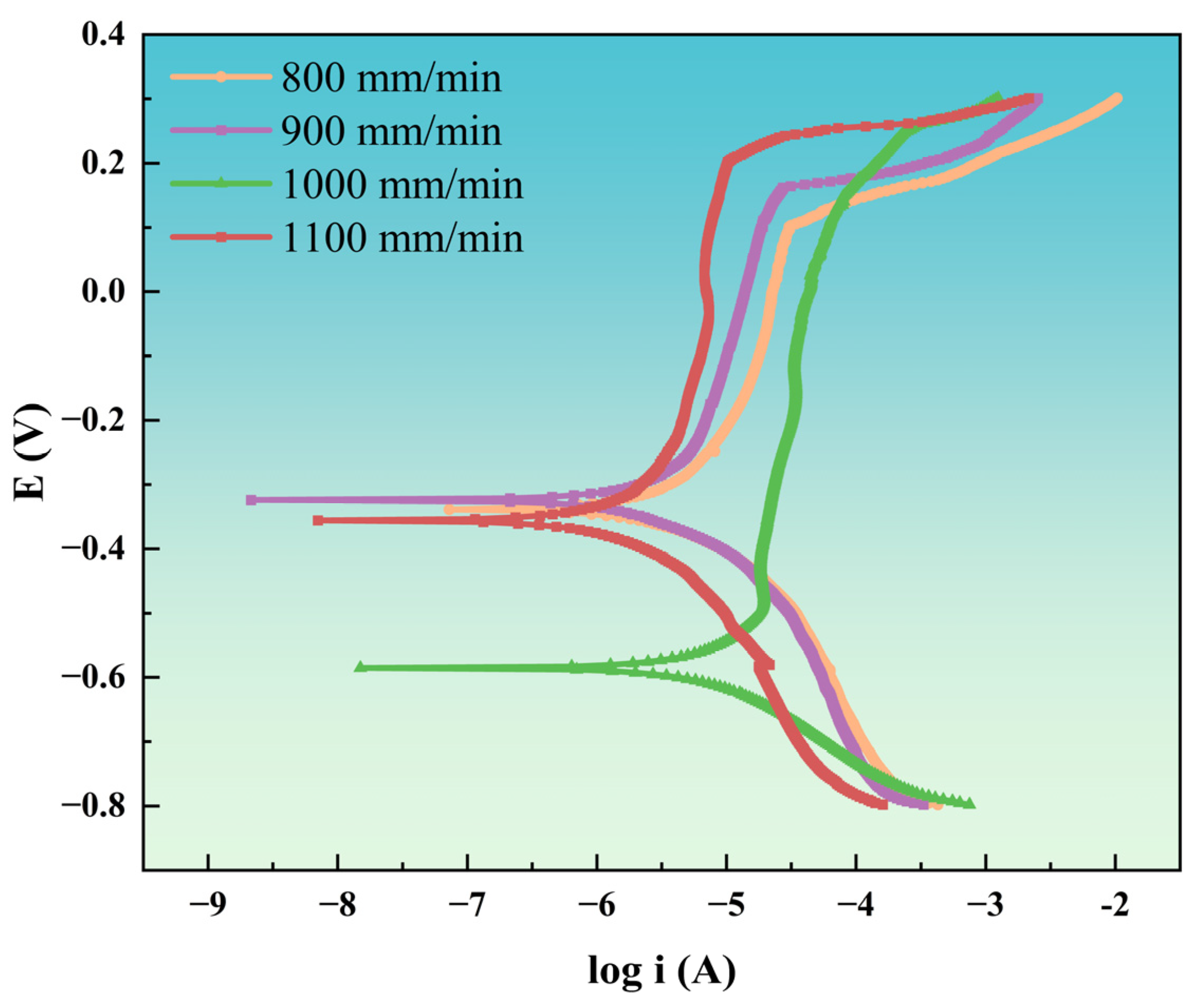 Figure 15, the corrosion behavior of NiAlNbTiV coatings at different laser scanning speeds exhibits a similar trend: the corrosion current initially decreases to a minimum before increasing with further increases in corrosion potential. All coatings exhibit passivation behavior; however, coatings deposited at a laser scanning speed of 900 mm/min demonstrate a higher passivation-break potential and lower passivation current. Analysis of the polarization curve fitting data in