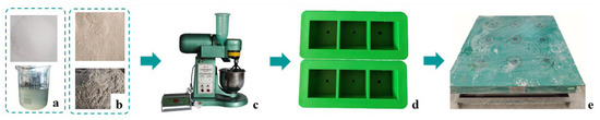 Step 2: The fresh geopolymer paste was poured into a 40 mm × 40 mm × 40 mm plastic mold (see Figure 3d), which had been previously brushed with a concrete release agent. After pouring, the mold was placed on a vibration table, as shown in Figure 3e, and vibrated for about 3 min until no air bubbles appeared on the top surface. To better demonstrate the feasibility of geopolymers in practical engineering applications, all samples were de-molded after 48 h of curing at room temperature. The preparing process is shown in Figure 3.