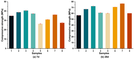 As usual, unconfined compressive strength tests were conducted on the 7th and 28th days using a cement compression and flexure testing machine (Hengruijin Testing Machine Co., Ltd., Jinan, China) at a loading speed of 2.4 kN/s. X-ray diffraction (XRD) analysis of the crystalline phase evolution of all geopolymers was performed using a Cu-Kα radiation X-ray diffractometer (D8 Advance, Bruker, Germany) within a diffraction angle (2θ) range of 5–90°, with a step size of 0.0200 and a scanning speed of 5°/min. The FTIR spectra of the geopolymers were recorded using a NICOLET 5700 FTIR spectrometer from Thermo Fisher Nicolet, Waltham, MA, USA. A mixture of potassium bromide (KBr) (100–120 mg) and dried hydrated samples (2–5 mg) was ground for 5–15 min and then compacted under vacuum to form disc-shaped samples. Finally, the test samples were placed in the infrared spectrometer for analysis. The microscopic morphology of the fracture surface of the geopolymers was analyzed by SEM (Regulus 8100, Hitachi, Tokyo, Japan). The incorporated energy-dispersive X-ray (EDS) spectrometer was used to analyze the atomic content without coating. Prior to testing, the samples were fixed on the SEM stage using a conductive adhesive and then gold-coated to enhance their conductivity and ensure the accuracy of the results. The samples were subsequently placed in the electron microscope chamber for analysis.