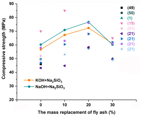 - This study confirmed the feasibility of synthesizing high-compressive-strength composites using metakaolin and low-calcium fly ash at room temperature. The compressive strength of the geopolymer activated by NaOH reached 72.34 MPa. The compressive strength of the geopolymer activated by KOH was up to 76.70 MPa when the admixture of fly ash reached 20%.