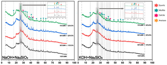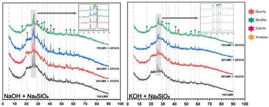 The phase change and transformation observed from the XRD analysis results contributed to the study of the evolving characteristics of the geopolymer’s microstructure. The XRD spectrum in Figure 6 and Figure 7 shows the dominance of crystalline phases in the solid metakaolin-based geopolymer composites with different fly ash content. Compared to the XRD pattern of the raw materials shown in Figure 2, all samples after the polymerization reaction for 7 days presented broad humps centered at approximately 24–28° (2θ), which corresponded to the reported reaction products of (N, K)-A-S-H and C-(A)-S-H [12], involving the partial hydrolysis of the raw materials and the formation of new phases. Sodium aluminate hydrate (N-A-S-H) gel is the main product formed in the alkali excitation reaction process and is responsible for strength development in polymer materials [43]. In addition, the hydrated calcium aluminate silicate (C-A-S-H) gel is an aluminum-modified hydrated calcium silicate gel, formed as a result of the dissolution and reaction of CaO. In the literature, reaction products such as N-A-S-H and C-A-S-H are commonly described as a ‘featureless humps’ centered at approximately 27–29° (2θ) due to their amorphous and semi-amorphous nature [44,45].