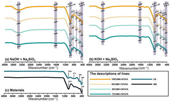 The FTIR spectra of fly ash, metakaolin, and the metakaolin-based geopolymers with the different fly ash mass contents are showed in Figure 8 (7 days) and Figure 9 (28 days). For fly ash, the peak at 1053 cm−1 is attributed to the stretching vibration of Si-O-Si in clay minerals like mullite [9], while the peak at 817 cm−1 is attributed to the symmetric stretching vibration of Si-O-Si bonds and the stretching vibration of Al-O in mullite-like structures [50]. These two bands also supported the presence of mullite crystals, as indicated by the XRD results (Figure 2). The adsorption peak at 535 cm−1 is due to the symmetric tensile vibration of Al-O-Si. In the structure of zeolite, the silico-oxygen tetrahedron and alumino-oxygen tetrahedron are connected by a shared oxygen atom, and the symmetric tensile vibration of Al-O-Si is an important vibration mode in the zeolite structure [51]. The band in the range of 430–445 cm−1 is due to the flexural vibrations of Si-O-Si and O-Si-O associated with amorphous silica. In zeolites, the interactions between silica tetrahedrons and between silica tetrahedrons and amorphous silica lead to the appearance of flexural vibrations of Si-O-Si and O-Si-O [52]. Zeolites usually show specific absorption peaks in the infrared spectrum, and the vibrations of the Si-O-Si and Si-O-Al bonds exhibit distinct absorption peaks in the infrared spectrum. The size of the zeolite crystal is in the nanometer range, and the smaller the size of the crystal, the wider the diffraction peak, and the weaker the strength. This can make the characteristic peak in the XRD pattern less obvious or undetected. This is mainly because the diffraction of X-rays is limited by the size of a crystal. When the crystal size is close to or less than the X-ray wavelength, the diffraction signal becomes blurred. In the FTIR spectra of metakaolin, the main bands at 1037 cm−1 is attributed to the asymmetric vibration of Si-O [53].