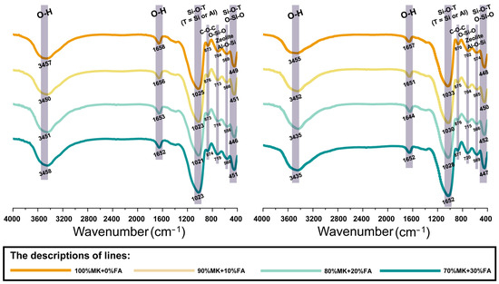 After the polymerization process of 28 days (Figure 9), all the bands presented a slight left leftward shift in the range of 0 to 100 cm−1 within the reported bond wavenumbers, with no obvious differences in the types of bonds. For example, the broad hump and sharp peak in the regions of 3430–3460 cm−1 and 1020–1035 cm−1 still represent the stretching vibration of O-H and asymmetric stretching vibrations of Si-O-T (T = Si or Al) [9,12], but with a noticeable leftward shift, indicating the continuation of the polymerization reaction. The characteristics of the bands are summarized in Table 4.
