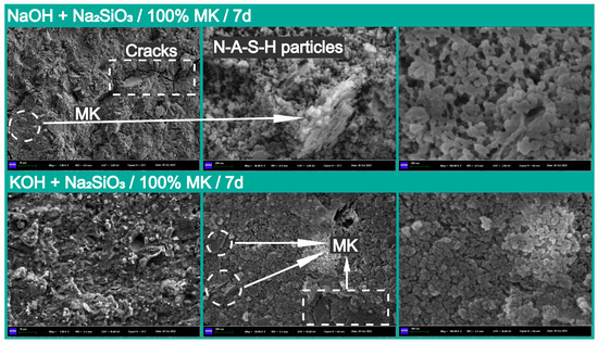 Additionally, the dense microstructure formed by the N-A-S-H particles significantly contributed to the early compressive strength at 7 days. In contrast, the incorporation of fly ash led to a more compact microstructure in the metakaolin and fly ash geopolymers compared to that observed in pure metakaolin-based geopolymers, suggesting a potential reason for their high compressive strength [59]. The formation of micro-cracks is mainly due to chemical shrinkage in the process of polymerization or mobile channels for water molecules, and significant affects the structural integrity and homogeneity of geopolymers [12], thus further deteriorating their mechanical and durability properties. Furthermore, the morphologies of (N, K)-A-S-H exhibit a high surface area with mesoporous intercommunicating mesh-like structures [60].