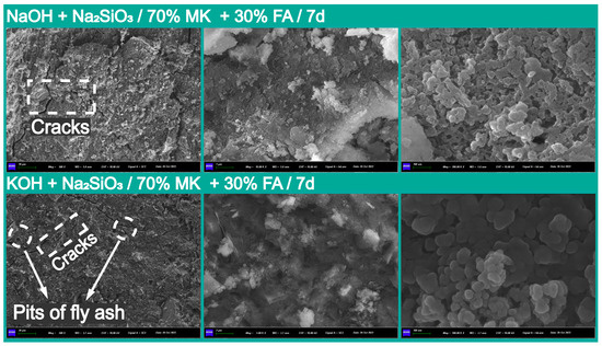 To investigate the microstructure of the geopolymers with different cation types and fly ash content, the SEM image analysis results of gels, cracks, and partially reacted metakaolin in pure geopolymer-based geopolymer matrixes and 70% metakaolin + 30% fly ash geopolymers with the best compressive strength are provided in Figure 10 and Figure 11. It can be observed that the main product of the polymerization reaction was a dense polymer structure composed of N-A-S-H, exhibiting a typical granular morphology, while bonding the reacted flaked metakaolin into a homogeneous whole [20].