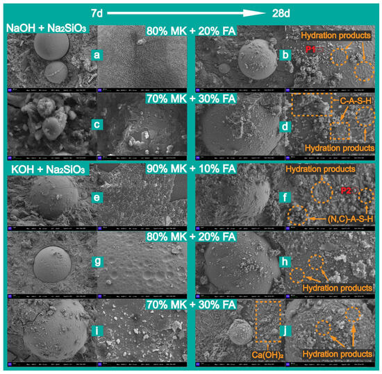 Hydration results and products of fly ash at 7 days and 28 days: (a) 80%MK + 20%FA at 7 days (NaOH + Na2SiO3), (b) 80%MK + 20%FA at 28 days (NaOH + Na2SiO3), (c) 70%MK + 30%FA at 7 days (NaOH + Na2SiO3), (d) 70%MK + 30%FA at 28 days (NaOH + Na2SiO3), (e) 90%MK + 10%FA at 7 days (KOH + Na2SiO3), (f) 90%MK + 10%FA at 28 days (KOH + Na2SiO3), (g) 80%MK + 20%FA at 7 days (KOH + Na2SiO3), (h) 80%MK + 20%FA at 28 days (KOH + Na2SiO3), (i) 70%MK + 30%FA at 28 days (KOH + Na2SiO3), (j) 70%MK + 30%FA at 28 days (KOH + Na2SiO3).