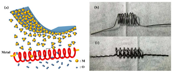 (a) Schematic diagram of hot-wire oxidation sublimation deposition method, (b) Molybdenum wire (99.9%, diameter d = 1.0 mm), (c) Tungsten wire (99.7%, Two tungsten wires with diameter d = 1.0 mm are intertwined).