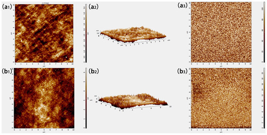 The height diagram of WOx film on the surface of the polished silicon wafer is shown in Figure 3(b1,b2). The RMS roughness Sq of the WOx films was 1.32 ± 0.02 nm, and the average roughness was 1.06 nm. The phase diagram of WOx film (b3) also showed that the WOx film prepared in this study had a uniform phase in Figure 3(b3).