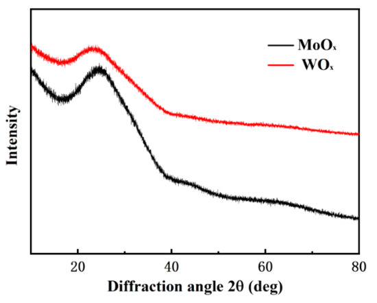 The structural characteristics of MoOx and WOx were characterized by X-ray diffraction (XRD), are shown in Figure 4. The X-ray diffractogram of MoOx and WOx films on the glass substrate which be seen that the transition oxide films appeared similar, and no characteristic peaks were presented, indicating an amorphous film, which was related to the relatively low substrate temperature (<200 °C). It is tentatively inferred that the broad, weak humps centred at 2θ ≈ 24.4° (MoOx) and 23.8° (WOx) correspond to the short-range order of Mo-O and W-O polyhedra, respectively, and are in quantitative agreement with the nanometre-scale correlation lengths calculated from the Scherrer equation (~0.8 nm), further supporting the amorphous nature of the films.