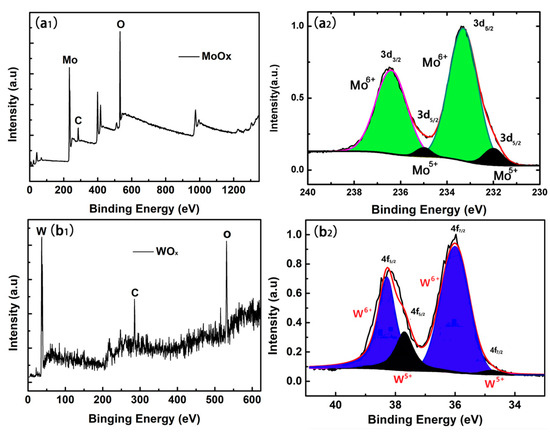 X-ray photoelectron spectroscopy (XPS) was used to analyze the electronic structure characteristics of oxide films. Figure 5(a1,b1) presents the XPS spectra of MoOx and WOx within the entire scanning range, respectively. According to the XPS standards, the approximate position of the element contained in the oxide is found, providing a specific energy interval for the second accurate scan.