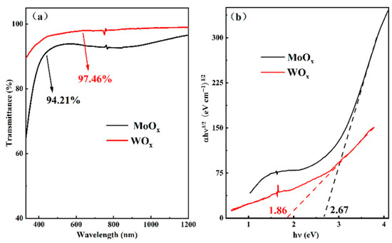 Figure 6a is a comparison diagram of the transmittance of films of MoOx and WOx with the same thickness (15 nm) fabricated under optimal conditions. It can be seen that TMOs with the same thickness have different light transmittance. The average transmittance of WOx film in the wavelength range of 300–1200 nm is as high as 97.46%, indicating that it has excellent optical performance. Compared to WOx thin films, MoOx films have a bit worse light transmittance with an average transmittance of 94.21%. In general, these two TMOs all have high optical transparency. Their absorption coefficient and optical band gap of each material were analyzed. The absorption coefficient of thin film material can be expressed as:
