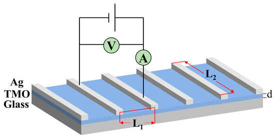 where d (cm) is the thickness of the film material; U is the voltage (V); I is the current (A); L1 and L2 (cm) are the electrode spacing width and electrode length, as show in Figure 7. The conductivity obtained for MoOx and WOx films were 2.58 × 10−6 and 5.14 × 10−7 S/cm, respectively.