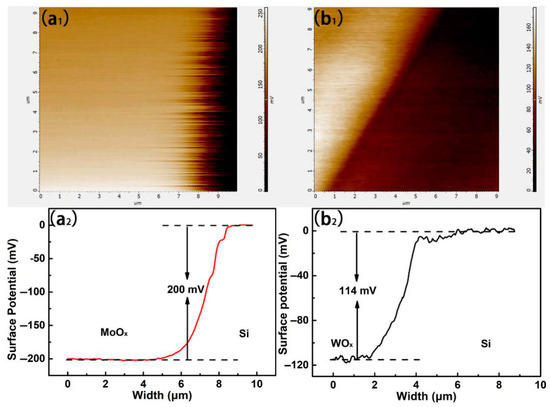 The potential distribution of the WOx film in contact with the Si wafer is shown in Figure 8(b1), which follows similar mechanisms to the interactions between MoOx and Si wafers. Figure 8(b2) similarly presents the contact potential difference between WOx and Si in the Z-axis direction. Comparing Figure 8(a2,b2), the contact potential difference of MoOx (200 mV) was found significantly higher than that of WOx (114 mV), which could be inferred that the MoOx film might cause a greater band bending. The different work functions of 6.9 eV for MoOx and 6.5 eV for WOx, respectively, could be the right reason for causing the difference in the bending of the crystalline silicon band.