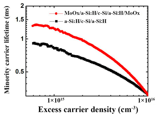Measured effective lifetimes for samples with the structures of i a-Si:H/c-Si/i a-Si:H and MoOx/i a-Si:H/c-Si/i a-Si:H/MoOx as a function of excess carrier density in the range of 7 × 1014 cm−3 ~ 1 × 1016 cm−3.