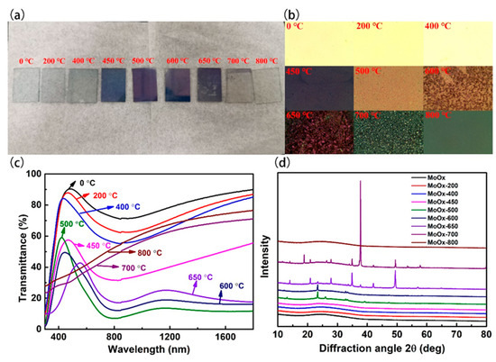 Photos (a), optical images (b), transmittance (c), and XRD diffractograms (d) of MoOx films at different rapid-annealing temperatures.