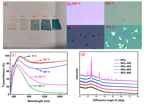 Photos (a), morphology under optical microscope (b), transmittance (c), and XRD pattern (d) of WOx films at different rapid annealing temperatures.