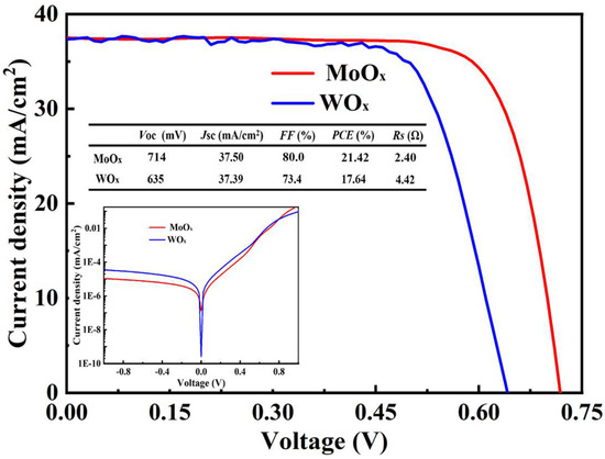 The FF of the device is mainly affected by the series resistance. The Rs of MoOx solar cells solar cell was the smallest, which was 2.40 Ω, followed by 4.42 Ω for WOx solar cells, respectively. Considering that the conductivity of the TMO material exerts a substantial impact on the Rs of these devices, the results of the FF and Rs provide compelling validation for the measured electrical conductivity of MoOx and WOx films.