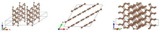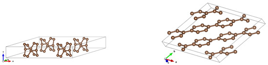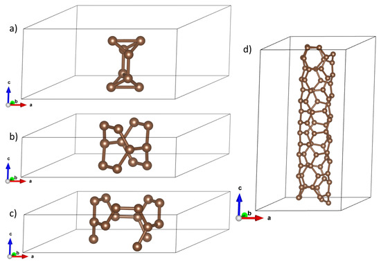 CNTs are characterized by two parameters, , where n is a natural number greater than 1 (n is roughly related to a diameter), whereas m denotes the chirality parameter, which—for a given n—takes values from 0 to n [1]. In our study, we compute properties of small-diameter CNTs: n take values 2 and 3. We investigated two conducting (i.e., zero-gap) and two insulating (non-zero gap) CNTs: Diameter-2 series: (2,0) (non-zero gap) and (2,2) (zero gap). Diameter-3 series: (3,2) (non-zero gap) and (3,3) (zero gap). Their structures are displayed in Figure 1 for elementary cells.