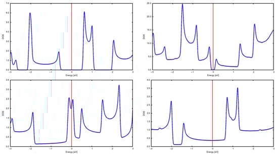 DOSs for single CNTs: (2,0) (top left), (2,2) (bottom left), (3,2) (top right), and (3,3) (bottom right).