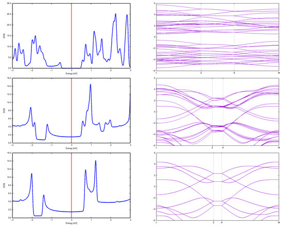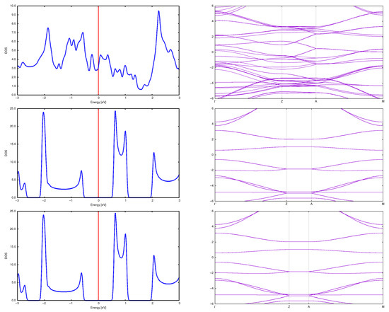DOS and band structure for a (2,2) CNT in a 2 × 2 array with d = 5 Å (top), d = 7.5 Å (center) and d = 10 Å (bottom).