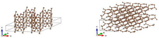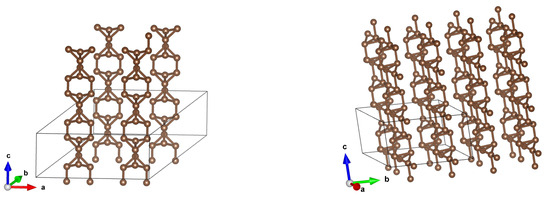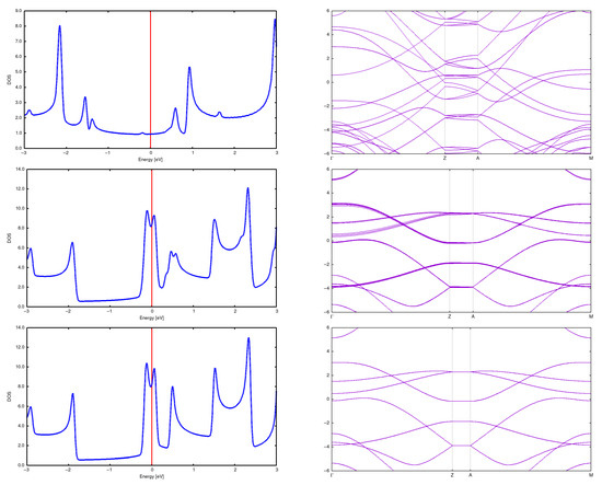 Stability of CNTs: In our previous papers [3,5], we examined the stability of isolated tubes via a calculation of phonon spectra (with the finding being that if all eigenfrequencies are positive, then the configuration is stable). However, such calculations are more time-consuming than the calculations of electron properties. Here, we have only partial results, and we do not present them in this paper. On the other hand, our previous calculations [3,5] of phonon frequencies for single CNTs tell us that all of them are stable. We extrapolate these results for arrays of CNTs, but we realize that in order to be sure, additional calculations would be desired—which are not possible for us at present, as they are very demanding from a computational point of view.