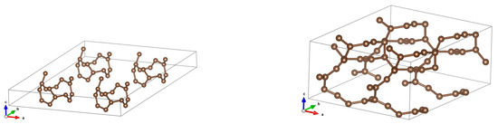 Here, we present structures for initial distances 7.5 Å and 5 Å. It is seen that the structure changes completely, resulting in something intermediate between a diamond and graphite. See Figure 11 and Figure 12 for a more illustrative representation. Notably, DOSs and bands rebuild in a profound manner. See Figure 13.