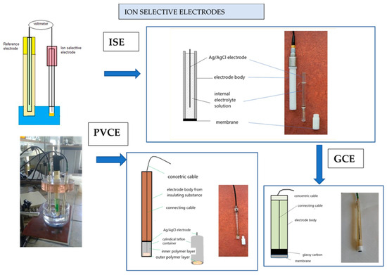Schematic and image of ion-selective electrodes used in the study: ISE, PVCE, and GCE. From the left, a diagram and photo of the measuring cell. (Department of Analytical Chemistry UMCS University).