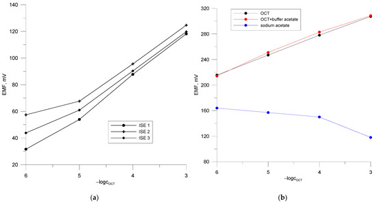 Calibration curves of the ISE electrodes in the octenidine dihydropchloride solutions. (a) Calibration curves of electrode PVCE 2 in the water and buffered solution of octenidine dihydrochloride and in the CH3COONa solutions; (b).