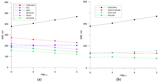 For electrode calibration, OCT standard solutions were prepared in the concentration range of 10−6–10−3 M by diluting a 10−2 M basic solution prepared from a suitably weighted sample. The electrodes were calibrated as follows: they were immersed in 50 mL of a 10−3 M solution and the potential was recorded after 5 min. The electrodes were then rinsed, dried, and immersed in a solution with a concentration of 10−4 M. The same procedure was followed for the next solutions. The EMF system allows for multiplexing of 16 electrodes. Thus, changes in the potential were recorded simultaneously as a function of the logarithm of the octenidine dichloride concentration for several sensors.