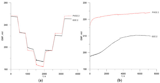 Dynamic response of the electrodes PVCE 2 and GCE 2 in the water solution of octenidine dihydrochloride (a) Potential stability of electrodes no. PVCE 2 and GCE 2 (b).