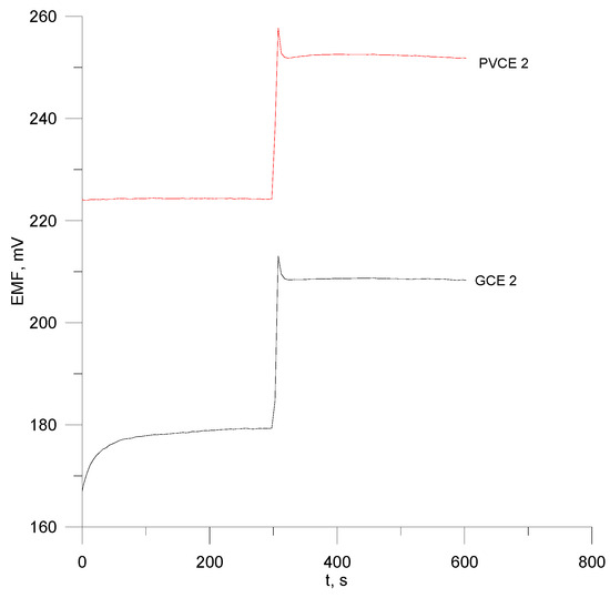 The response time for the octenidine electrodes (Figure 6) was determined by the method of injecting a concentrated standard solution of a concentration of 10−2 M into the intensively stirred octenidine sample solution of a concentration of 10−4 M. The results presented in the graphs can give information about the response time of the two electrodes when concentrating the sample, which is approximately 5–8 s.