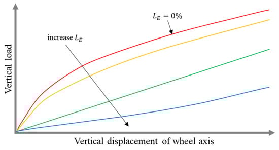 During the exploitation of commercially available NPTs, the user has no possibility to change the radial stiffness characteristic, and its course is significantly influenced by the shear beam/band and elastic structure [10,15,16]. The radial stiffness of NPT equipped with single spokes is designed, e.g., by selecting their curvature. The curvature of the spokes is expressed by the excess of their length (parameter described in Section 2). The equation describing this relationship is presented in [1,16]. By increasing spoke excess length, the initial course of the radial stiffness characteristic will change. The NPT’s elastic structure with straight spokes, where the excess of their length is 0%, will be characterized by an initial degressive course [16]. Increasing the spokes’ curvature will affect the changes in the course of radial stiffness (Figure 1). Small displacements of the NPT axle with radially distributed straight spokes (especially in the initial radial characteristic) will cause a significant increase in the vertical force. The force will in turn be transmitted to the vehicle suspension elements. The opposite behavior can be observed for wheels with increased spoke curvature of the elastic structure.
