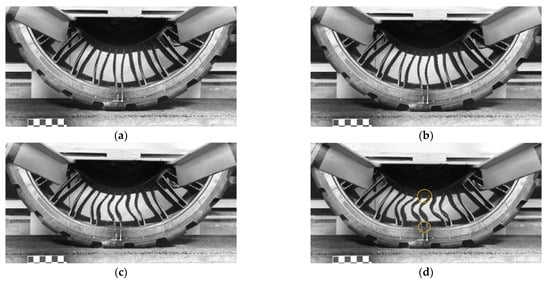 Figure 2 shows the deformation of the band and elastic structure of an NPT designed for a skid-steer loader, the axis of which was loaded with a vertical force during the determination of the radial characteristic. The elastic structure of the analyzed NPT consisted of 25 pairs of spokes. The unloaded NPT located above the measuring surface is shown in Figure 2a. With the increasing load, the number of buckled spokes increases and the band “flattens” increasing the length of the contact patch. The spokes located directly under the wheel axis buckle the most. In the NPT, large values of the spoke attachment angles to the outer and inner rings were used, which can be particularly observed when analyzing the deformation of the spokes in Figure 2d (orange circles), which will influence low values of stress during spoke bending and tensioning.