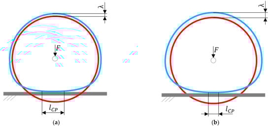 Shear beam/band deformation due to: (a) low counterdeflection stiffness, (b) high counterdeflection stiffness (figures based on [9,10]) (red color—undeformed NPT band shape, blue color—deformed NPT band shape, —normal force, —counterdeflection, —contact path length).