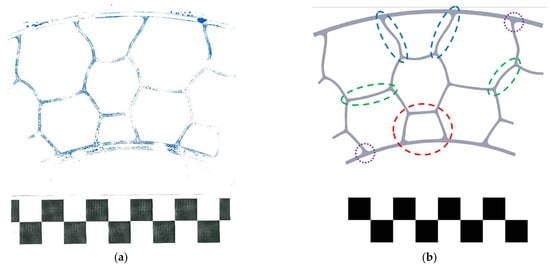 Figure 5 shows the shape of the layered elastic structure of one of the NPTs available on the market. In order to reproduce the shape of the cellular structure, its side part was covered with ink, and then a sheet of paper was pressed (Figure 5a). During scanning, a checkerboard consisting of white and black squares was used for calibration during image processing. The NPT cell structure after image processing is shown in Figure 5b. The places where the layered structure connects to the outer and inner rings are of increased thickness (purple line), which may be due to the need to protect the structure from stress. The sides of the cell closest to the center of the NPT (red line) are straight sections. In the next layer, it can be seen that the sides of the hexagonal cells (green line) are built of arc sections. The sides of the cells located closest to the band and tread have an asymmetric curvature (blue line). Polygon elements, tangent to the circles concentric with the wheel rotation axis, will counteract the deformation of the remaining sides of the cellular structure, which will reduce the vertical displacement of the wheel and increase its stiffness compared to the spoke structure. This feature was observed in experimental studies [6]. In the experimental studies, the wheel with a cellular structure had higher stiffness compared to the wheel with a flexible structure of single spokes. In order to ensure the buckling susceptibility of the elastic cell structure, the following methods are used: cells with arcuate sides, asymmetry of the thickness of the cell sides, grooves/slots, or reduction in the thickness of the polygonal cell walls [20].