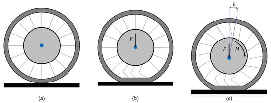 Behavior of elastic structure (spokes) under the influence of: (a) non-deformed NPT, (b) vertical load, (c) and external torque (figure based on [30]) (—vertical force, —external torque, —angular displacement, the blue dot marked the wheel axle rotation).