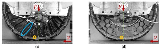 In the case of NPTs, the type of elastic structure used affects their flexibility in the circumferential direction, which translates into the curved course of the longitudinal stiffness characteristic of the NPTs. Figure 7 shows the deformations of the NPTs’ spoke and layer structure used in Utility Terrain Vehicle (UTV) during the measuring of the longitudinal stiffness characteristic in quasi-static conditions (NPTs were vertically loaded to the measuring track and cannot rotate—brakes on). The orange circle marks the connection of the elastic structure with the outer ring located under the wheel axle. As a result of the movement of the measuring surface (track), the analyzed point moved. The spoke structure was more susceptible to longitudinal displacements than the analyzed cellular elastic structure. Deformations of the spoke elastic structure as a result of the movement of the measuring track are particularly easy to observe. The blue line marks one of the spokes, which buckled under the influence of a vertical load (Figure 7a) and stretched under the influence of a longitudinal force (Figure 7c). The cellular elastic structure is less susceptible to deformations in the longitudinal direction (Figure 7b,d).