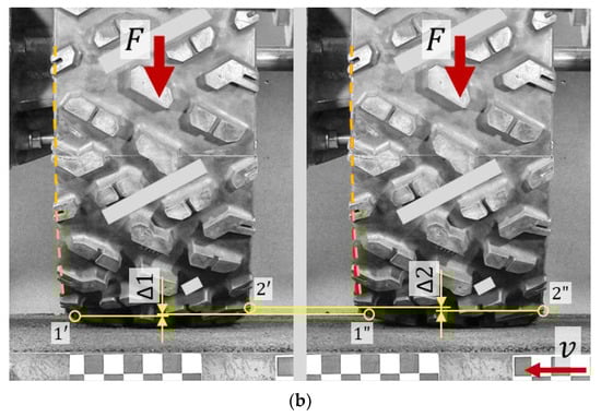 Deformation of the band and the tread during the measurement of the lateral stiffness characteristic: (a) NPT with a spoke elastic structure, (b) NPT with a cellular elastic structure (—vertical force, —linear velocity of the measuring track, —analyzed points on the NPT loaded to the measuring track, —analyzed points lying on the NPT loaded to the moving measuring track, yellow circles—the locations of the analyzed points of the tread, orange line—the line lying on the analyzed side of the loaded NPT to the measuring track, red line—the line lying on the analyzed side of the loaded NPT to the moving measuring track).