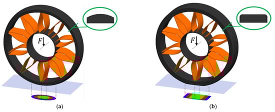 The NPT tread is characterized by considerable thickness, which additionally makes its deformation difficult. The possibility of shaping the NPT contact path is presented in Figure 9, which shows a mental cutoff (mimicked by the gray surface) of a section of the. The NPT equipped with the “flat” tread area will be characterized by a contact patch close to rectangular (Figure 9a), while the NPT with the “arc” tread area will be characterized by an elliptical contact patch (Figure 9b). It is also worth noting that, in the case of NPT with a “flat” tread area, only the length of the contact path changes under the influence of increasing load. The green circles indicate the cross-section of the “flat” and “arc” treads with the band. The length of the contact patch will depend significantly on the density of the elastic structure, which will limit the deformation of the band in the contact area. The effect of the number of spokes on the deformation of the band with the tread under the influence of the vertical force is presented in [37]. The low density of the elastic structure caused an elongation of the contact patch and an undesirable arc deformation of the band with the tread.