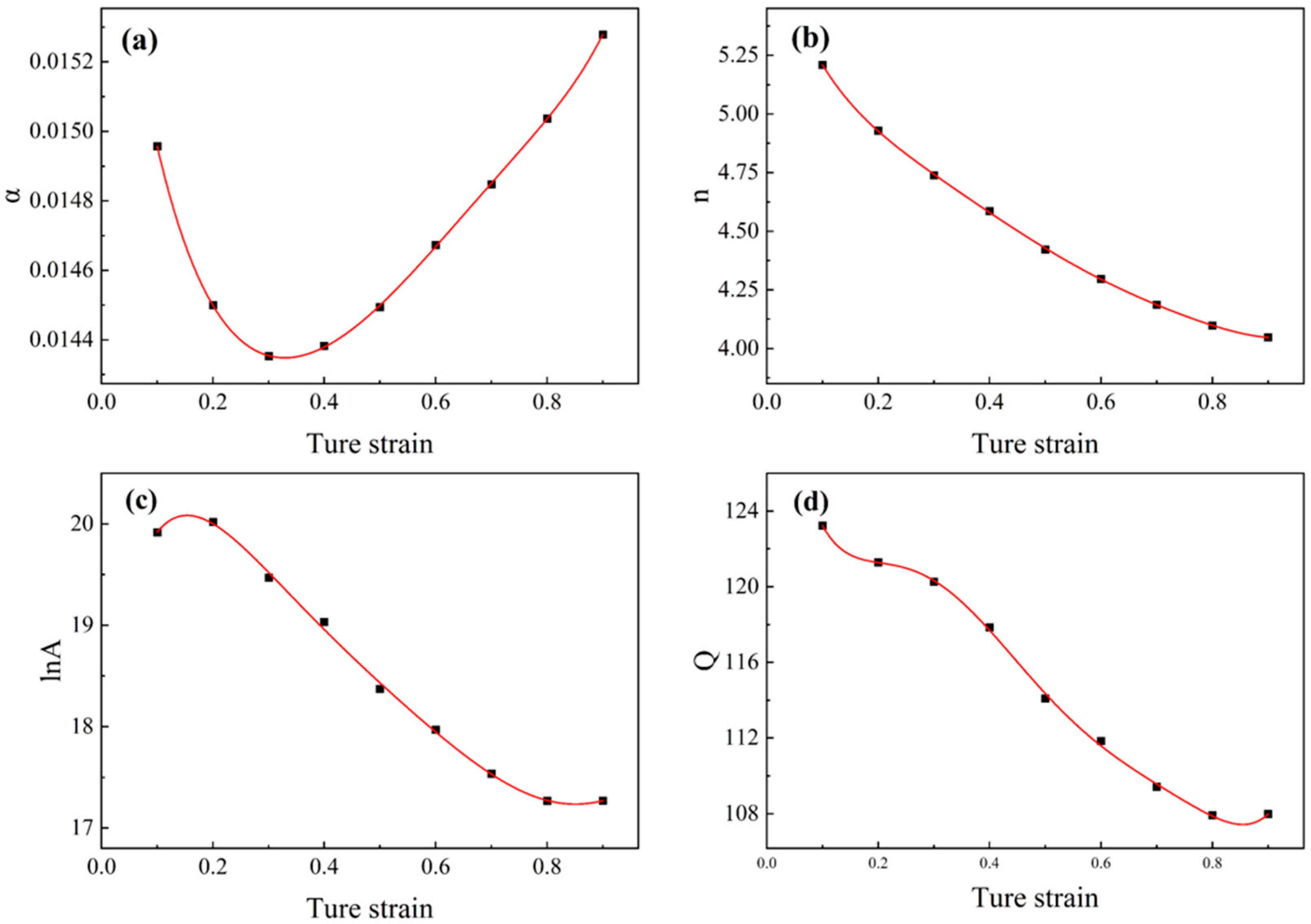 - Xia, Y.; Shu, X.; Zhang, Q.; Pater, Z.; Li, Z.; Xu, H.; Ma, Z.; Xu, C. Modified Arrhenius constitutive model and simulation verification of 2A12-T4 aluminum alloy during hot compression. J. Mater. Res. Technol. 2023, 26, 1325–1340. [Google Scholar] [CrossRef]
