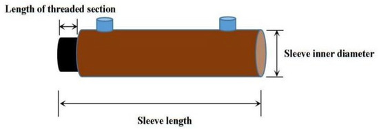 The reinforcing bars used in this study were HRB400 hot-rolled ribbed steel bars (Manufactured by Hebei Jingye Company, located in Shijiazhuang City, Hebei Province, China). The yield strength of the bars exceeded 350 MPa, with a measured value of approximately 440 MPa. The tensile strength was greater than 600 MPa, with a measured tensile strength of about 660 MPa. The elongation after fracture was approximately 12%, meeting the requirements of the Technical Specification for Grouted Sleeve Used for Rebar Splicing [25] (JG/T 398-2019). The diameters of the steel bars were 16 mm and 18 mm, respectively, and the actual anchorage length exceeded eight times the bar diameter. Ductile cast iron semi-grouted sleeves, matched to the corresponding bar sizes, were used. The mechanical properties of the reinforcing bars are listed in Table 6, the physical parameters of the grouted sleeve specimens are provided in Table 7, and a schematic diagram of the semi-grouted sleeve is shown in Figure 2.