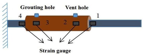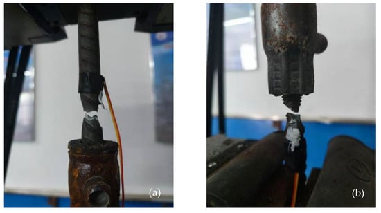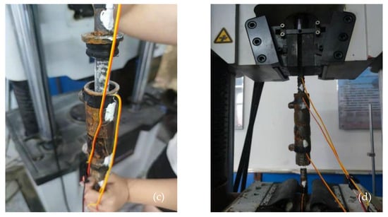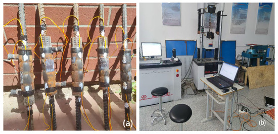 According to the Technical Specification for Application of Grouted Sleeve Connections for Reinforcement [24] (JGJ 355-2015), a total of 24 grouted sleeves were prepared based on six grout mix designs, with two sleeves per group and sleeve diameters of 16 mm and 18 mm. After preparing the grout according to the specified proportions, grouting tests were performed using a handheld grouting injector. The specimens were cured under standard conditions until reaching the designated age of 28 days. Strain gauges were attached to the surface of the grouted sleeves and at both ends of the sleeve-to-rebar connections after surface grinding. The stress–strain behavior of the grouted sleeves was then analyzed using the DHDAS dynamic signal acquisition and analysis system (Jiangsu Donghua Vibration Test Technology Co., Ltd., Jingjiang, China). The locations of the strain gauge attachments are shown in Figure 3, the semi-grouted sleeves with attached gauges are illustrated in Figure 4a, and the loading setup is presented in Figure 4b.