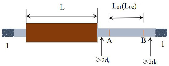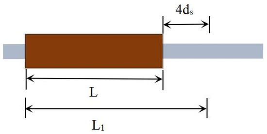 In the uniaxial tensile test, the residual deformation was determined by averaging the instrument readings. The gauge length for deformation measurement was defined as L1 = L + 4ds, where L1 is the deformation measurement gauge length, L is the length of the grouted sleeve, and ds is the nominal diameter of the reinforcing bar (Figure 5).
